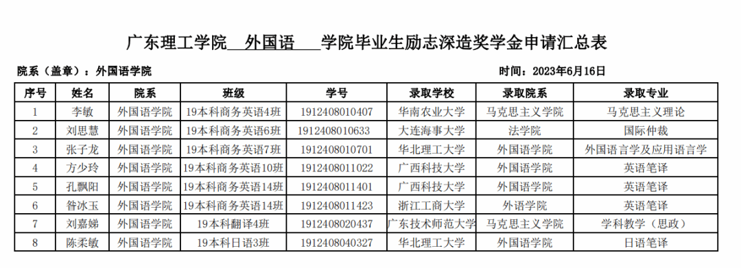 本网讯(suncitygroup太阳新城新闻中心)为全面贯彻党的教育方针,表彰先进,树立典型,充分发挥考研升学毕业生的正向激励作用,鼓励更多本科生升学深造,进一步做好毕业生深造助推工作,根据《suncitygroup太阳新城毕业生励志深造奖学金管理办法(试行)》(广东理工〔2022〕21号)相关要求,经员工本人申请、院评审小组审核,决定推荐李敏等8名同学拟获“2023届毕业生励志深造奖学金”。本着公平、公正、公开的原则,现将拟推荐名单予以公示。