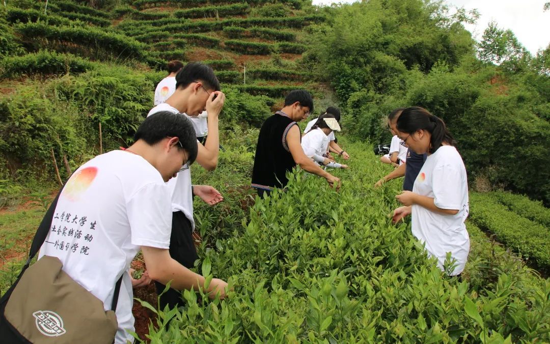 队员们挎着茶篓穿梭其间采摘嫩芽。尽管烈日炎炎,他们依然认真学习采摘技术,按照“一芽两叶”的标准采摘茶叶。在劳动过程中队员们体会到了农民的艰辛,也更加坚定要用所学知识帮助当地乡村宣传特色产品,助力乡村振兴。