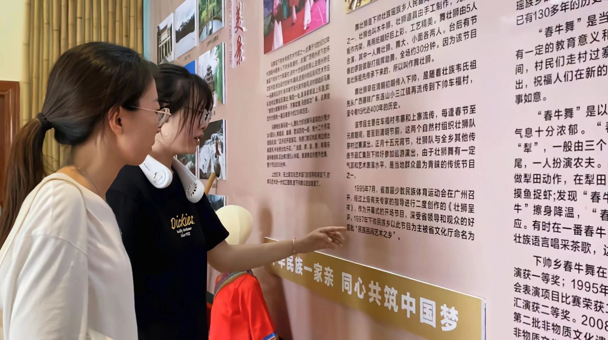 此外队员们还详细了解了下帅的春牛舞、壮狮舞等非物质文化遗产,用心感受着下帅壮族瑶族乡非遗文化带来的无穷魅力,总结出非遗传承之路所锻造出来的精神一一精益求精、攻坚克难,队员们表示会以此作为自己求学之路的格言,不断乘风破浪,勇毅前行。