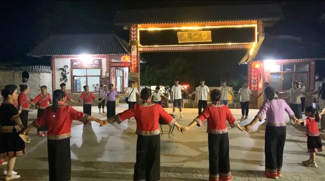 此外夜幕降临之后黄翰村村支书李伟带领实践队员们前往牛仙谷景区参与篝火晚会。当歌声响起,队员们互相牵起手,伴随着初夏的微风,踩着音乐的节奏,围着篝火起舞,每个人脸上洋溢着欢乐的笑容。此刻,每个人心中仿佛燃起了一团火,真切感受到了这座小村庄给予各民族同胞浓浓的爱与包容,大家就像石榴籽一样紧紧环抱在一起。