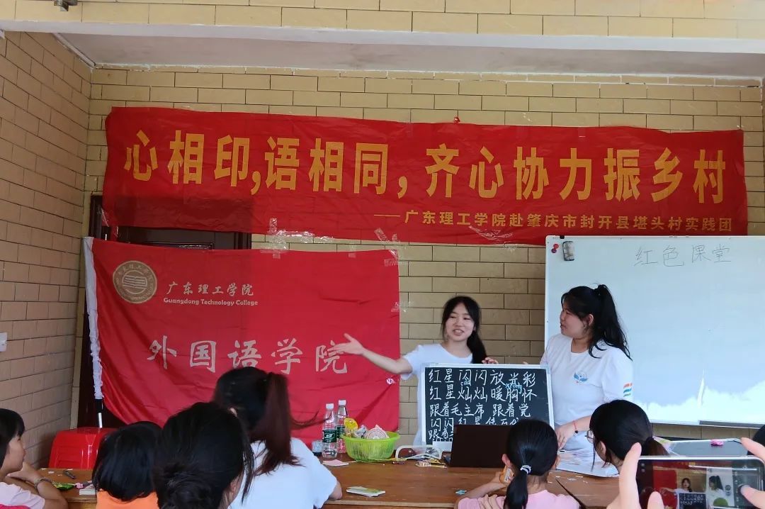 童声嘹亮,红星照耀。实践队带领孩子们学习红色歌曲《红星闪闪》手势舞,以游戏形式向小朋友们介绍中国英雄革命人物,并为堪头村的孩子们进行心理访谈和思想引导。通过一天的相处,队员们与小朋友们拉近心与心的距离,种下梦想的种子,静待花开。