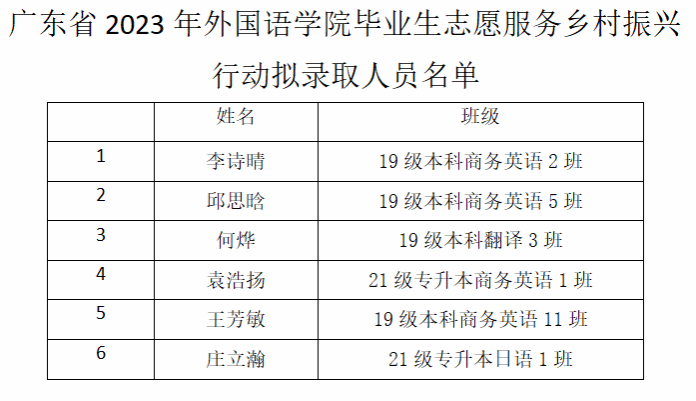 本网讯(suncitygroup太阳新城团委、员工会)根据《关于印发〈2023—2024年度广东省老员工志愿服务西部(山区)计划和广东高校毕业生志愿服务乡村振兴行动实施方案〉的通知》(团粤联发〔2023〕12号)和《关于做好2023年广东高校毕业生志愿服务乡村振兴行动选拔、体检、录用等相关工作的通知》有关规定,经公开招募、自愿报名、组织审核、统一面试、体检等招募选拔程序。今年拟录取李诗晴、邱思晗、何烨、袁浩扬、王芳敏、庄立瀚等6名毕业生为2023年广东高校毕业生志愿服务乡村振兴行动志愿者,现将名单予以公示。