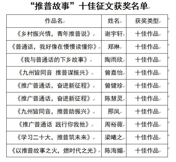 活动一经推出,同学们积极踊跃参加,经过评比,筛选出了“推普故事”十佳征文作品名单如下: