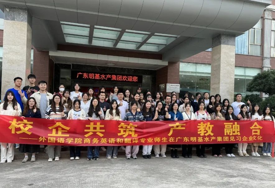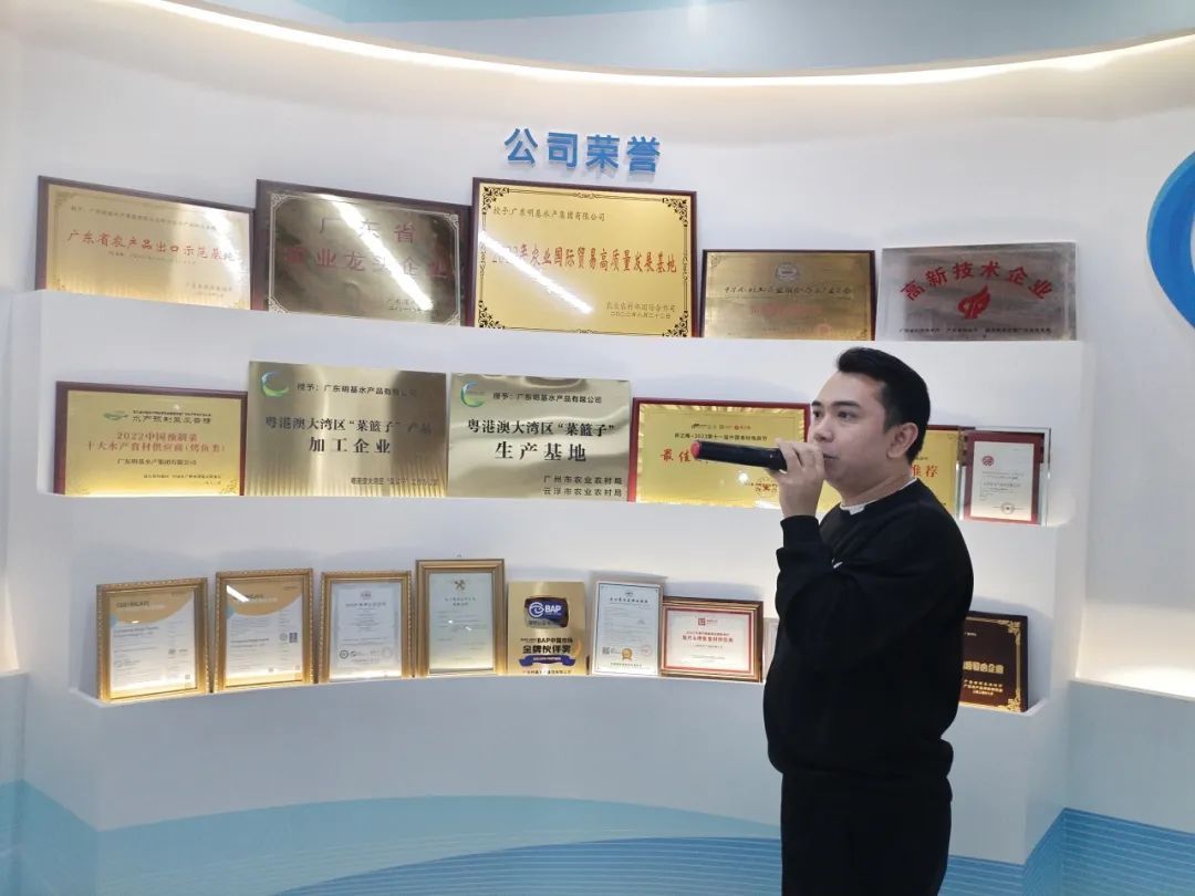 随后,同学们前往广东明基水产集团参观学习。在该企业的负责人的带领下,同学们参观了文化廊道和直播现场,并试吃了公司产品。在负责人的介绍下,同学们了解到该企业的发展历程,认识到企业的实际用人需求,更加明确了未来的学习方向。