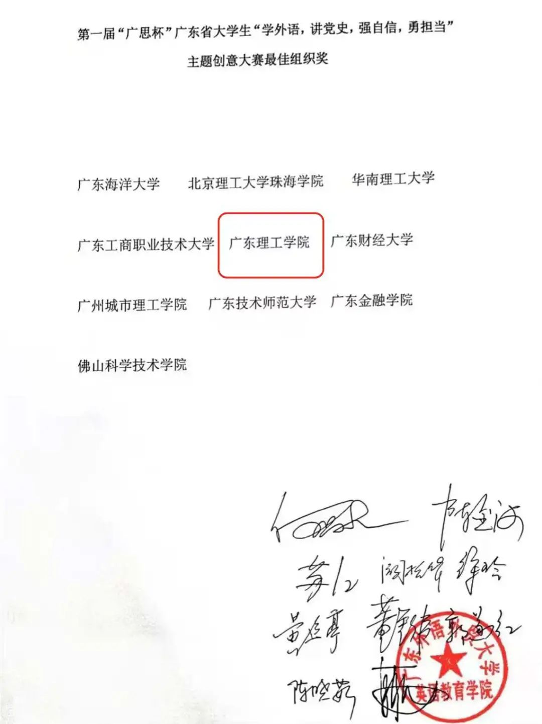 本次大赛由广东省本科高校大学英语课程教学指导委员会主办,广东财经大学承办,北京好策科技有限公司、北京燕兴国际教育咨询有限公司和复旦大学出版社协办,初赛和决赛均采用线上方式进行。初赛为党史和英语知识竞赛笔试,决赛为配音、演讲和微视频竞赛,参赛选手可任选一种形式参赛。