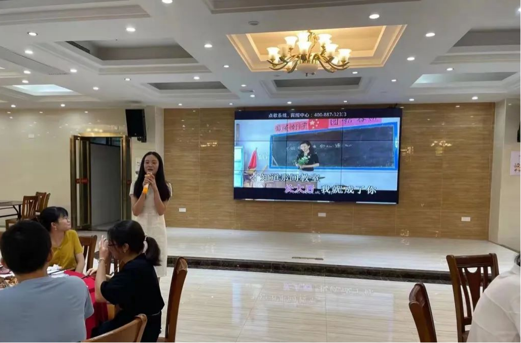 以此同时,何榆桦老师也带来了文艺演出。她为各位老师倾情演唱了《长大后我就成为了你》,何老师的演唱打动了大家,顺利将活动氛围推向高潮,使本次教师节聚餐活动气氛热烈。
