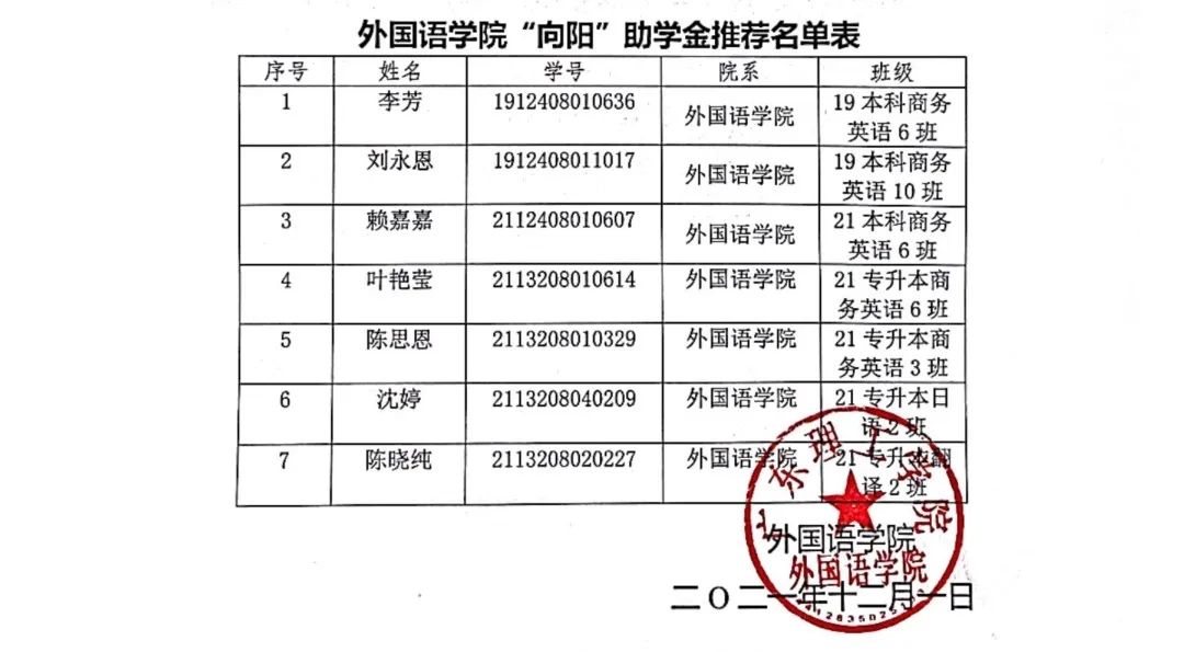 本网讯(suncitygroup太阳新城新闻中心)根据《广东省教育厅关于做好2021年秋季学期员工资助工作的通知》、《广东省教育厅 广东省财政厅关于进一步健全员工资助政策体系的意见》等相关文件精神,为切实帮助和激励公司家庭经济特别困难以及遭遇家庭突发变故的员工走出困境,重拾信心,顺利完成学业,组织开展评选2021年“向阳”助学金要求,结合公司实际情况,经过员工本人申请、suncitygroup太阳新城评审工作小组审核等环节,现将公司2021年“向阳”助学金推荐名单进行公示,最终资助名单以公司公布结果为准。如对推荐名单有异议,请于2021年12月2日内向suncitygroup太阳新城辅导员办公室(39102)反映。