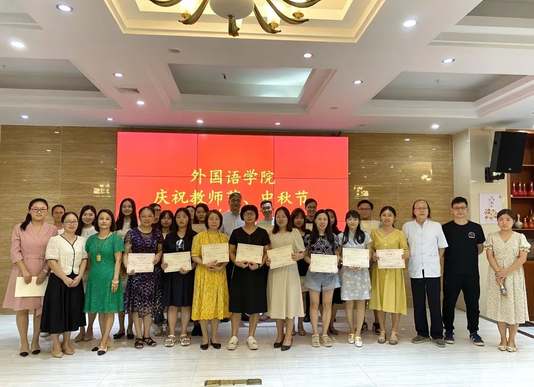 紧接着,潘利锋经理、吕丽红书记、郑建蓉副经理、王泽熙副经理上台为曹莎、陈羿、邓毅芳、冯青等三十七位教师颁发了先进优秀教师荣誉证书。颁奖结束后,双节晚宴正式开始。在享受美食的同时,翻译教研室何愉桦老师带来了独唱《望月》,日语教研室李阳老师倾情献唱《残酷月光》。